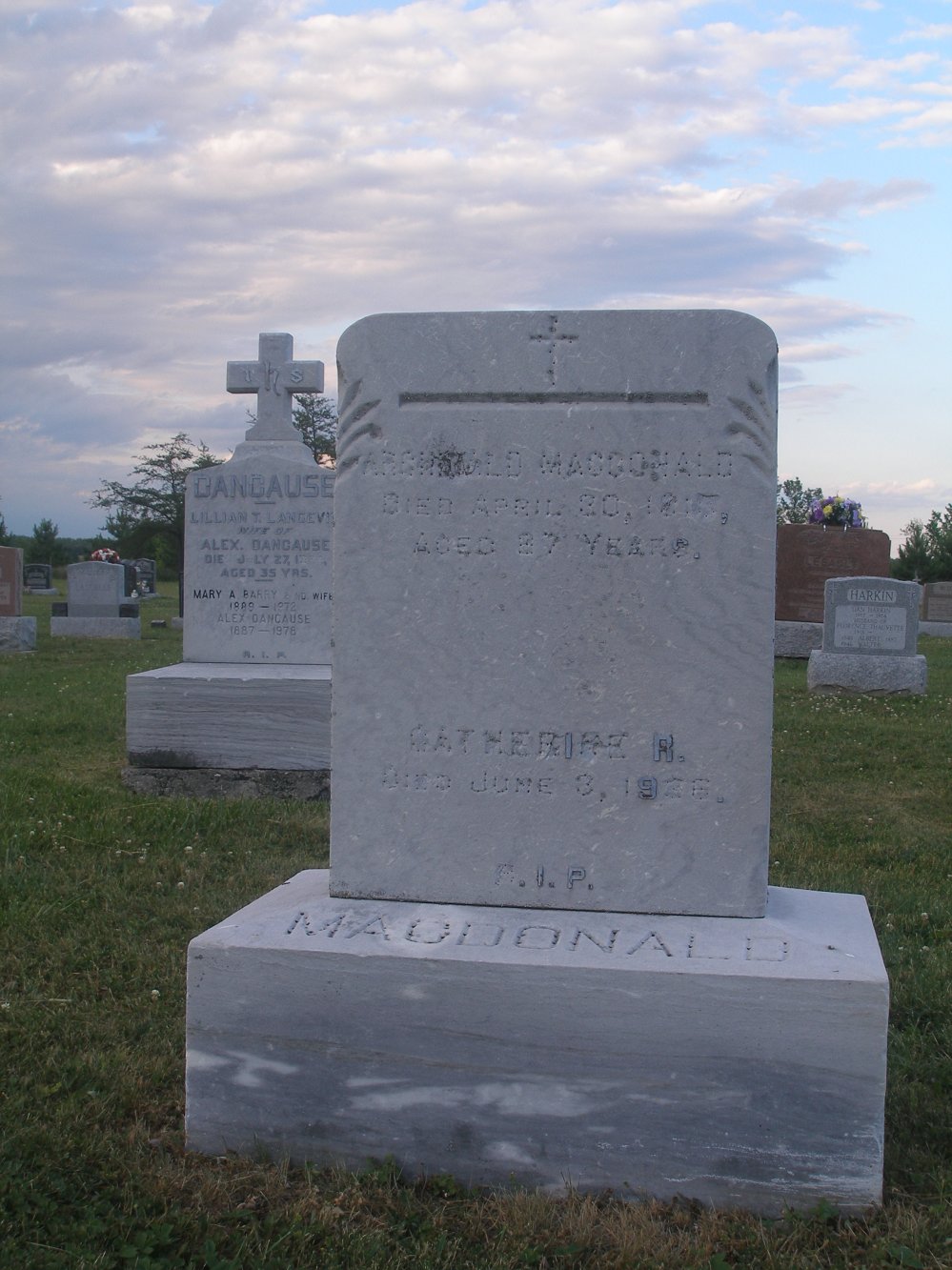 Right beside the Archibald MacDonald memorial, is another MacDonald. There are two markers to this site. The name on the left is Grant. The marker on the right appears to include the name Catherine Margaret MacDonald - 1888? - 1943.